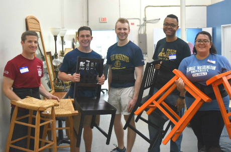 On Thursday, August, 18th the PAFs spent the morning volunteering at A Wider Circle in Silver Spring, Maryland where they worked to organize clothing and furniture donations to help create stability, dignity, and independence in the lives of those in need of such items in the community. Later that afternoon, the current PAFs were joined by five alums of the program to discuss how to translate PAF experiences into career success. Thanks again to Meredith (Waters) Barnes, SPH BS ‘13 MHSA ‘15; Alyscia Eisen, GWSB BBA ’08 MBA ‘10; Alan Elias, ESIA BA ‘00, GSPM MA ‘02; Brian Engel, ESIA BA ‘10 MA ‘12; and Ryan Evans, ESIA BA ‘08 MA ‘10.