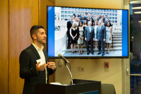Eric Thibault, CCAS BA ’11 MPA ’13, is one example of an engaged PAF alumnus. Eric volunteered to speak at the reception and shared his reflections on how PAF has shaped his career. He continued the speaking program by discussing the development of the PAF professional development competencies and how the competencies influenced his professional choices. Eric was among the first PAFs to participate in the professional development program, studying things such as conflict management, giving and receiving feedback, and other professional “soft” skills. These skills not only helped Eric in his first position with Deloitte, but they eventually led him to seek a position in human development. Eric now uses the professional skills he learned in PAF to create a constructive environment at his current firm, Appian.